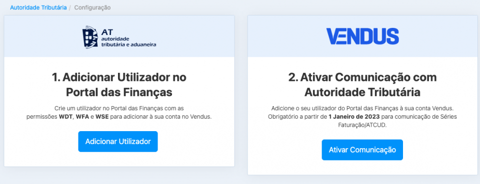 Para configurar esta questão, terá de no Backoffice do Vendus ir a Gestão > Autoridade Tributária. Caso nunca tenha configurado um utilizador para comunicação de documentos à AT no Vendus, irá ver estas opções: