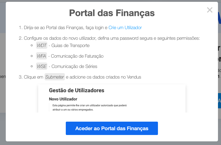 Clique no passo 1, Adicionar Utilizador, para criar o utilizador de acesso à AT que ficará configurado no Vendus. Irá aparecer um pop up com todos os passos a seguir.