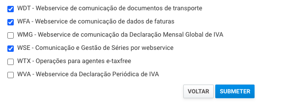 Selecione as operações autorizadas ao utilizador - WSE - Comunicação e Gestão de Séries por webservice é a autorização que necessita para a comunicação de séries. Se quiser que o utilizador sirva para comunicação do SAFT também, seleccione WDT - Webservice de comunicação de documentos de transporte e WFA - Webservice de comunicação de dados de faturas.