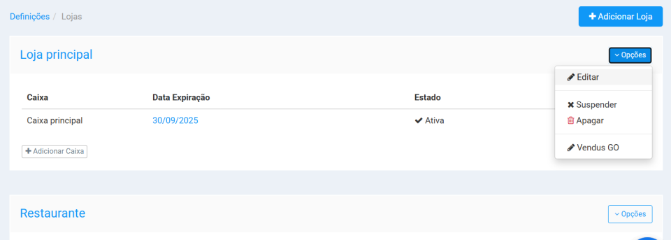 Caso pretenda trabalhar com, por exemplo, dois CAEs ao mesmo tempo, deverá ter configuradas duas lojas. Para associar o código CAE a uma loja, basta ir a Configuração > Definições > Lojas e Caixas. Edite a loja e encontrará o campo do CAE.