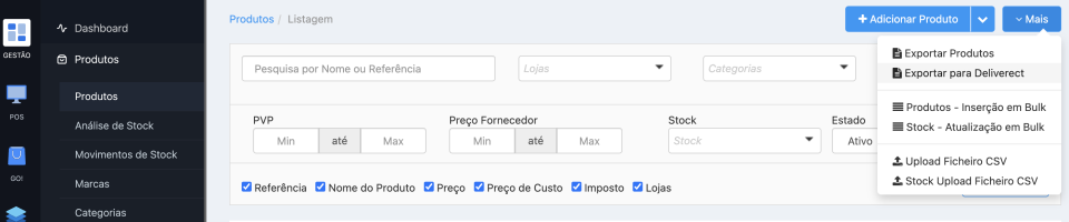 A partir deste momento, os seus produtos Vendus poderão ser sincronizados com a sua conta Deliverect. Para fazê-lo deverá ir a Produtos > Mais > Exportar para Deliverect