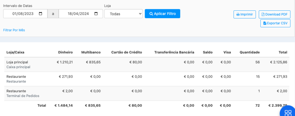 Para gerar um relatório com os tipos de pagamentos usados, vá a Gestão > Contabilidade > Tipos de Pagamento. Coloque o intervalo de datas ou mês desejado e poderá gerar o relatório.